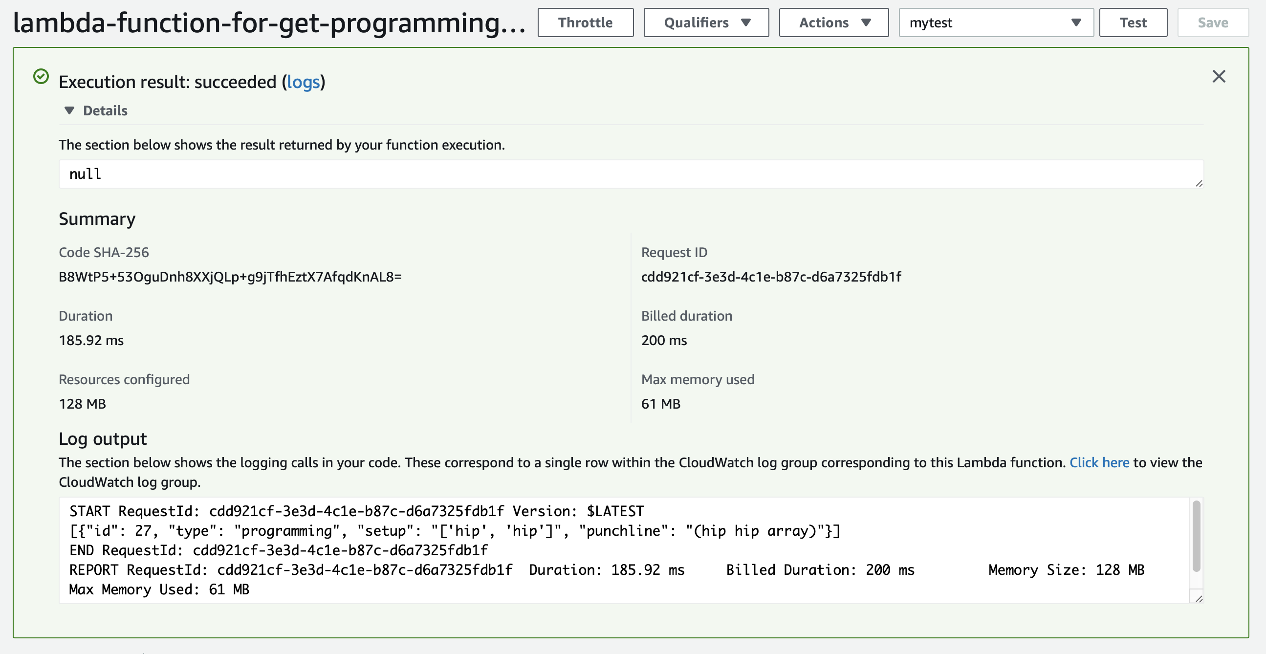 Let's define a function that calls the Joke API and get a programming joke. lambda_handler is the default handler for a Lambda function, which we will call with an empty event and context.