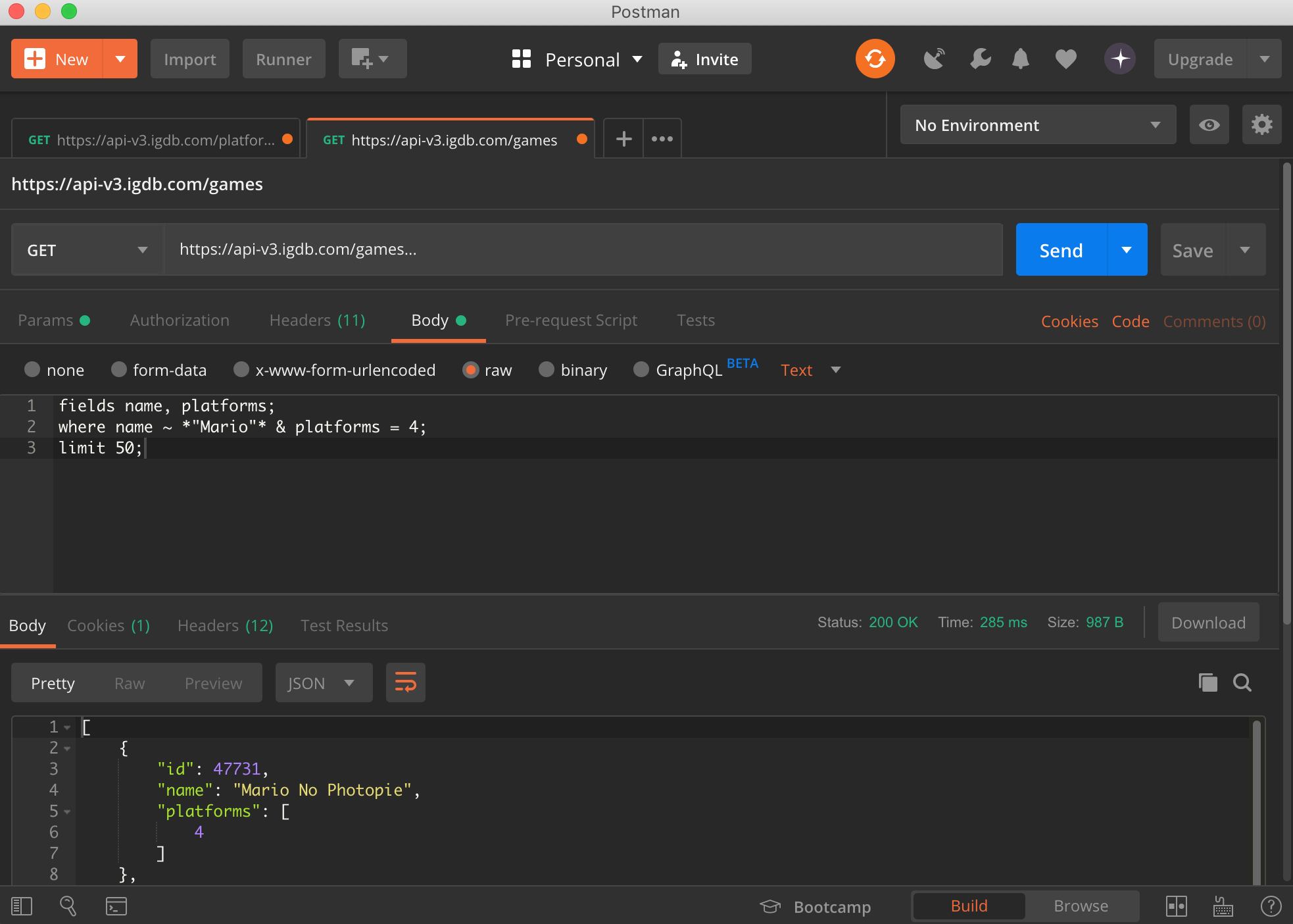 Second I hit the games endpoint to filter for N64 games that contain Mario in the name.