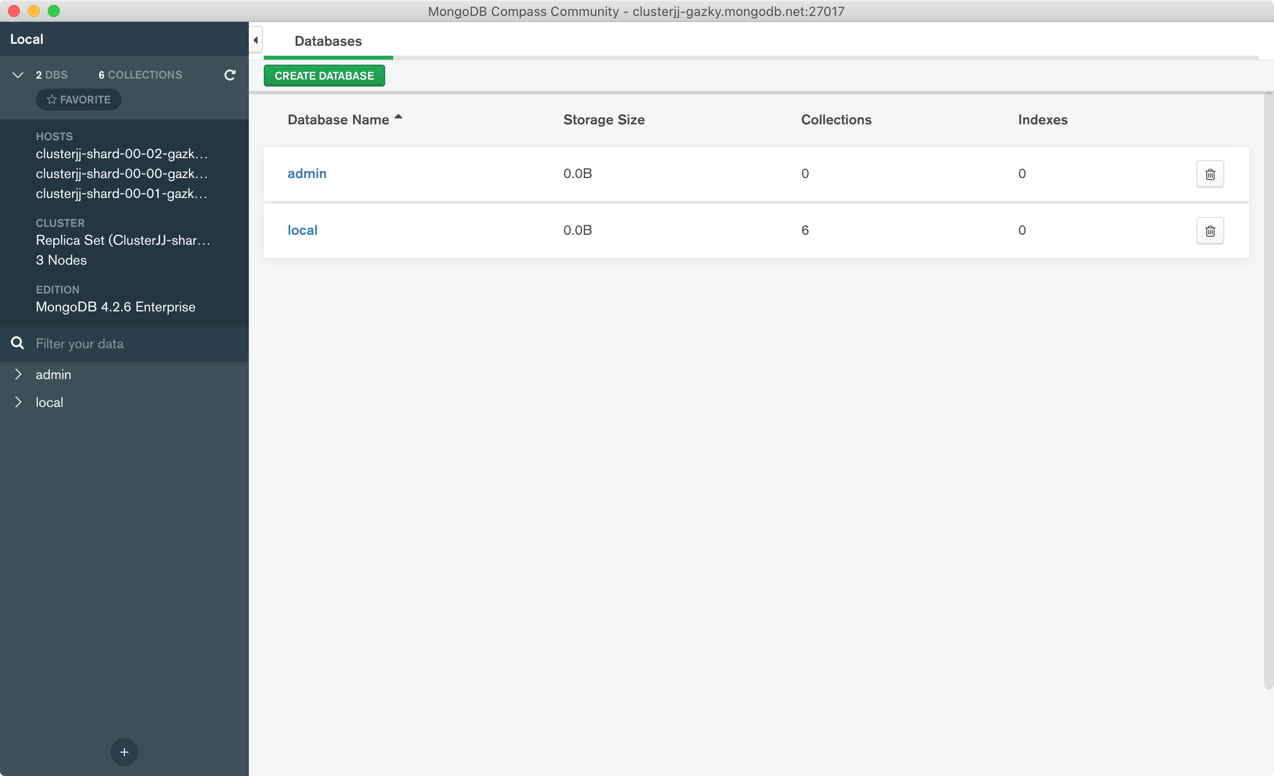 Once you have connected to the database the page will show your cluster, the hosts and the available data. Since we have not added anything yet it will show the default admin and local databases.