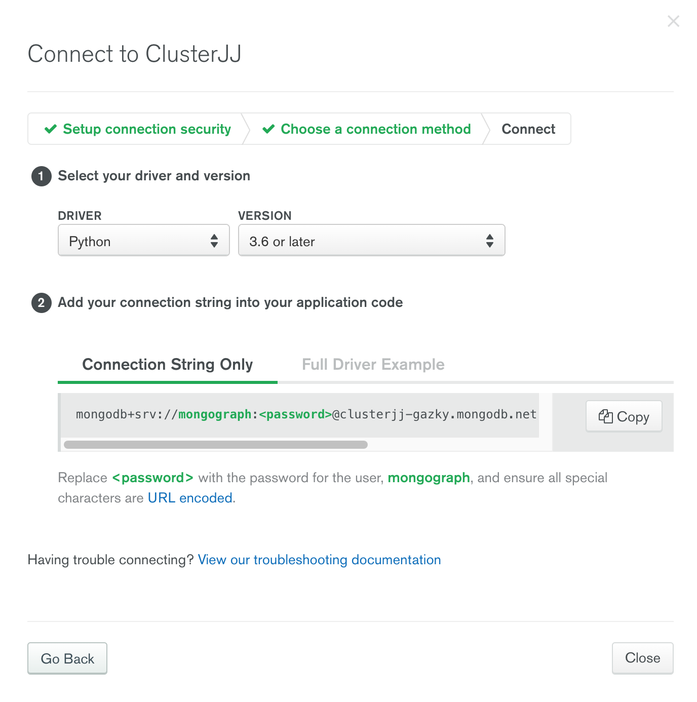 Finally go back to the Clusters overview and click on Connect. Choose the appropiate connection mechanism for your application. In my case this will be with Python 3.7. This should give you enough information to get started with MongoDB!