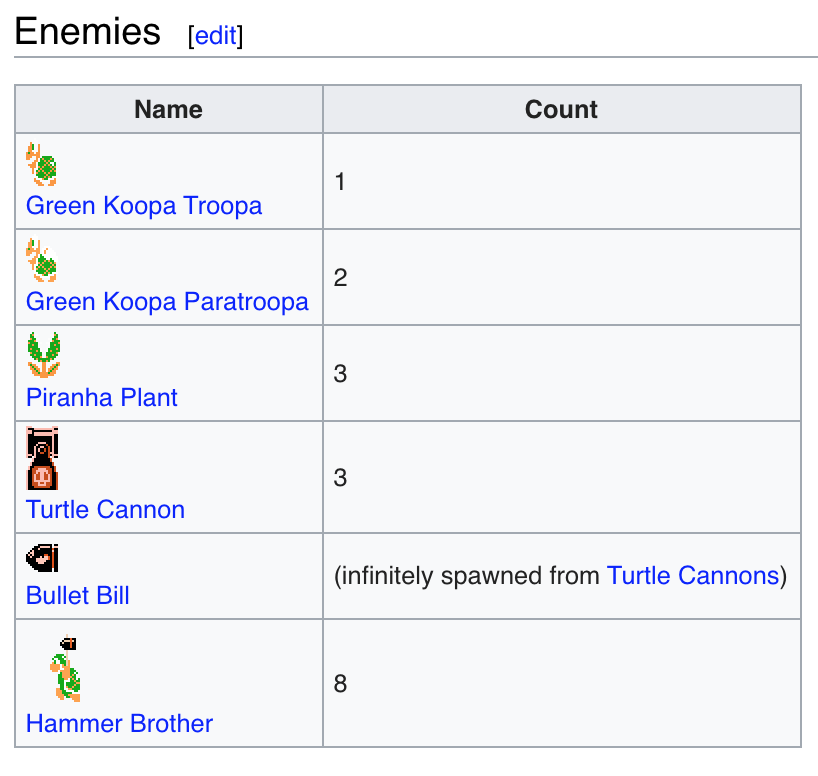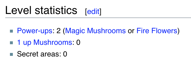 As a dataset I will be using information from https://www.mariowiki.com/. More specifcally I will be crawling data from Super Mario 1 levels from https://www.mariowiki.com/Category:Super_Mario_Bros._Levels. Each page with the level details has a table containing the Enemies and the Level statistics.