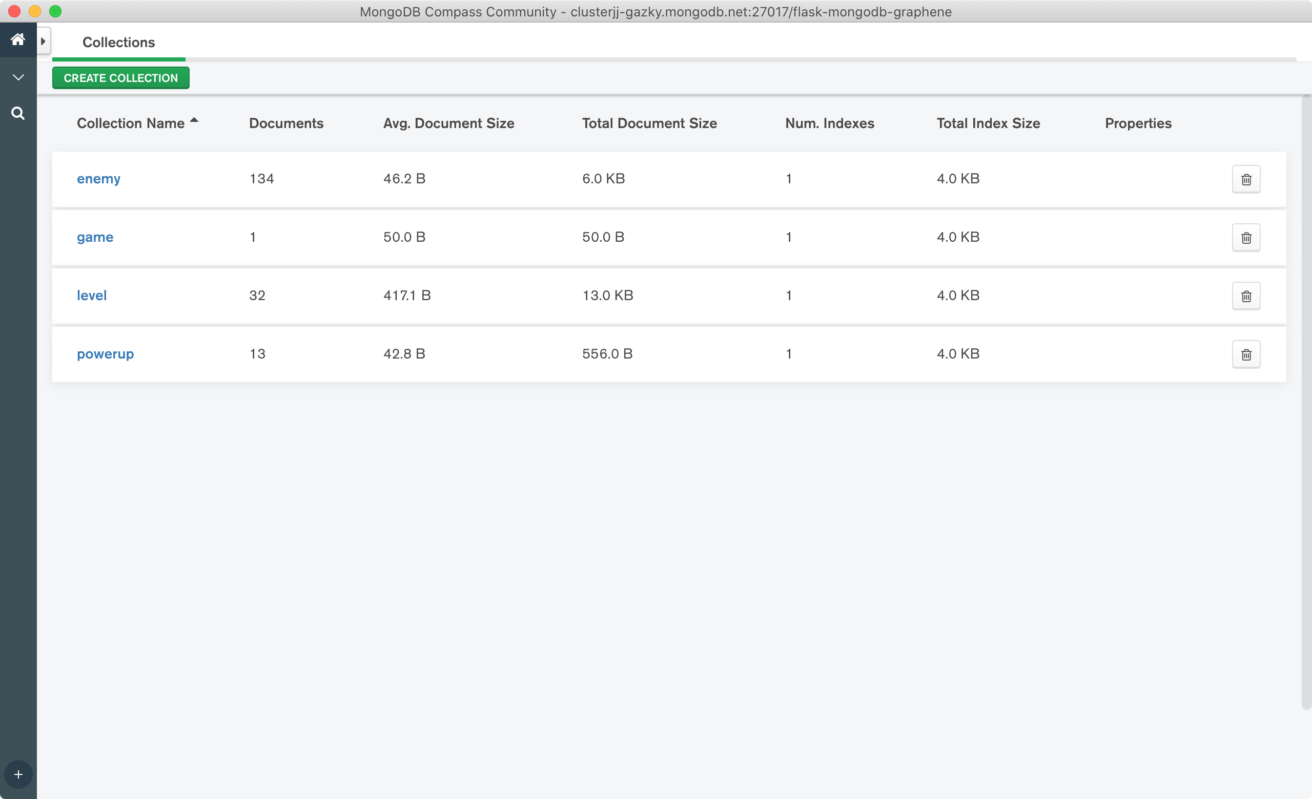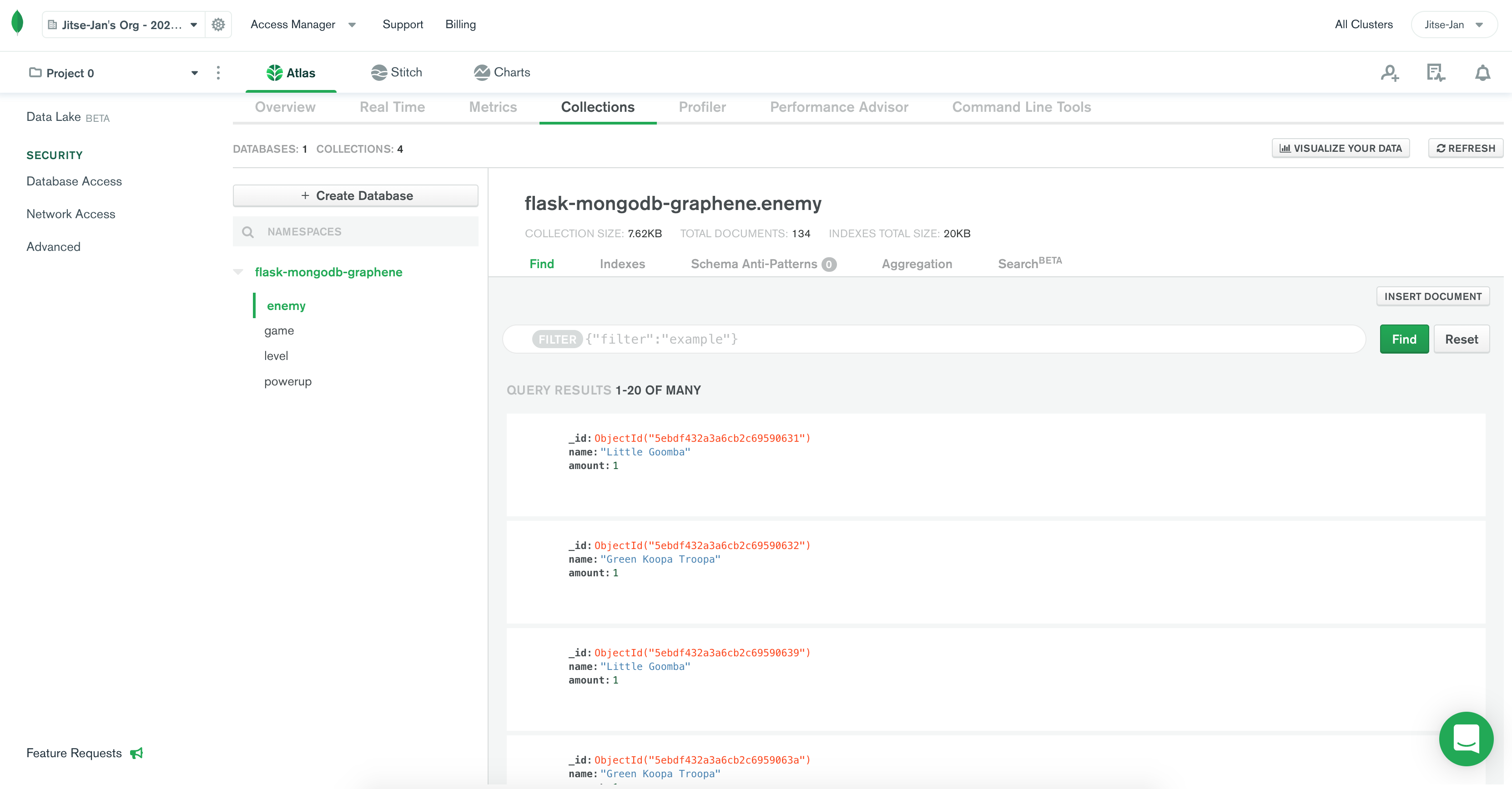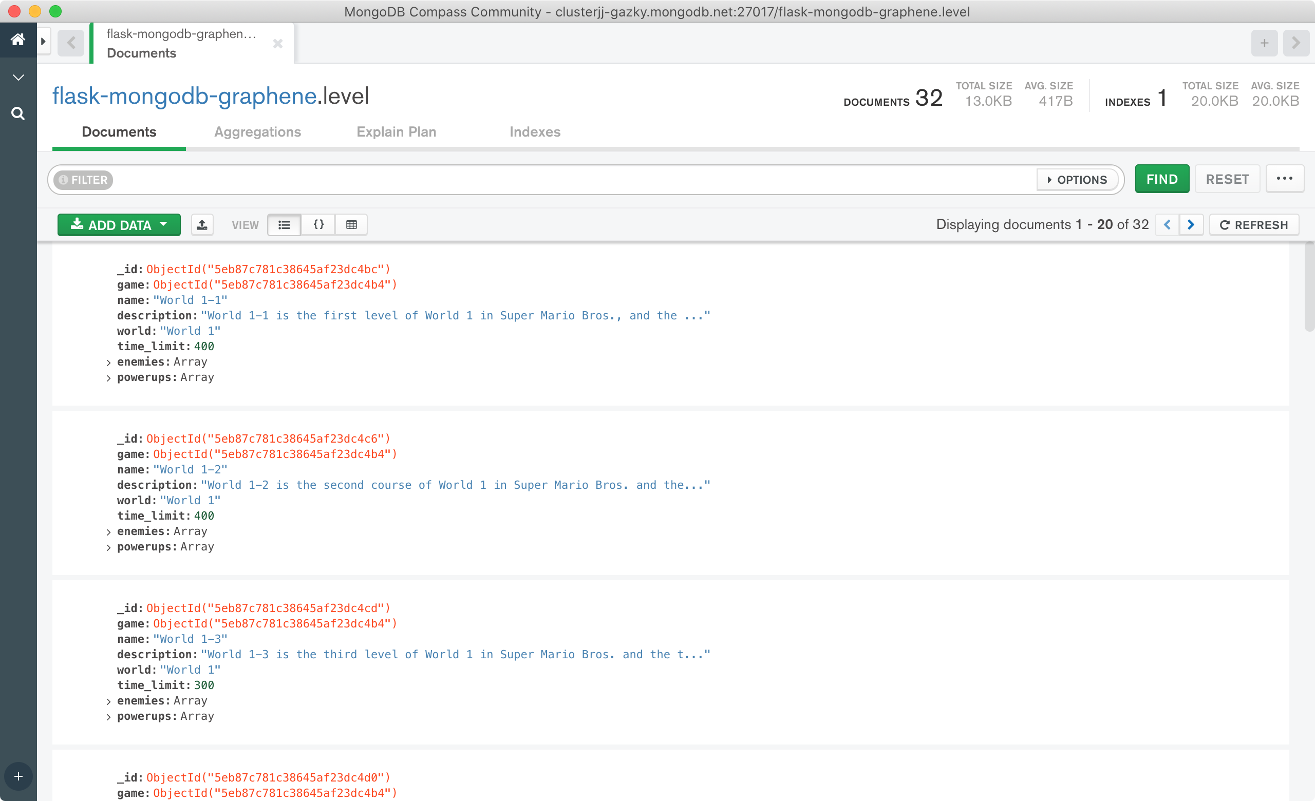 The first collectionGame only has a name, Powerup and Enemy have a name and amount and the Level collection will have more fields. A Level references a Game document, has a list of enemies and powerups, but also information on the time limit, boss, world and a description.