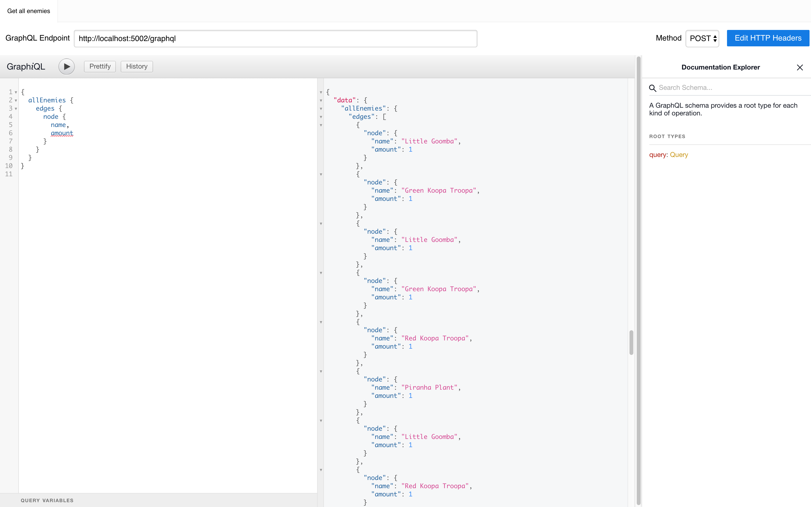 Using the standalone application GraphiQL it is easy to test the GraphQL endpoint. Using the allEnemies query defined in schema.py we get back all the enemies and their amounts.